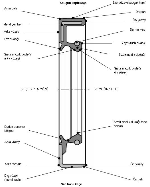 Standart bir yağ keçesi resimde görünen temel unsurlardan oluşur. Sıklıkla karşılaşılan genel iki tip kauçuk kaplı ve sac kaplı keçelerdir. Pek çok parça bu iki tip keçede ortak olmakla birlikte montaj ve kullanım açısından iki tasarım arasında bazı önemli farklılıklar mevcuttur.